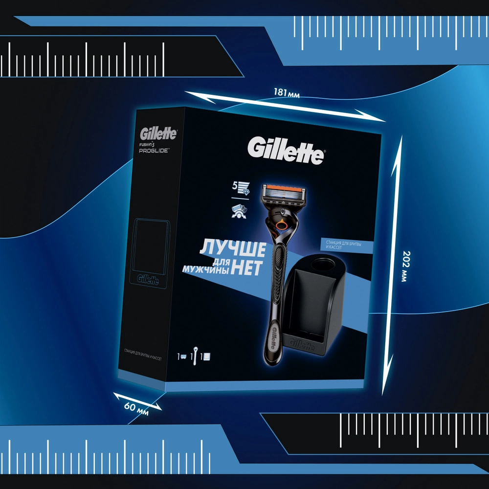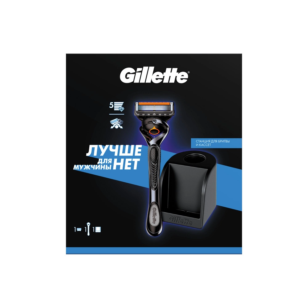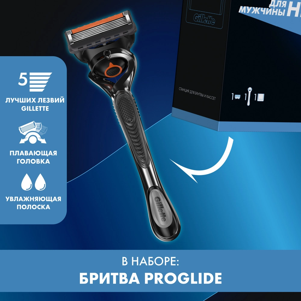 Подарочный набор для идеального бритья Gillette ProGlide. В набор входят бритва Gillette Fusion5 ProGlide и станция для бритвы и кассет.