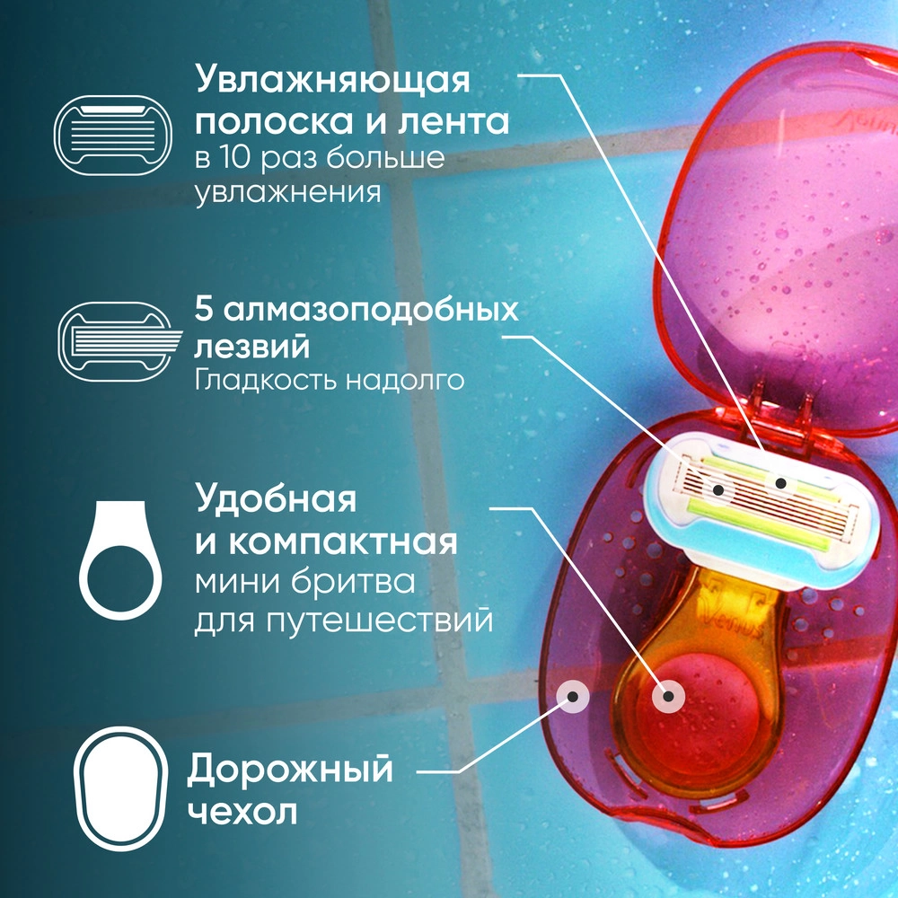 Gillette Venus Extra Smooth Snap — это компактная женская бритва, которая легко поместится в дамской сумочке, чемодане или спортивной сумке. Благодаря пяти лезвиям с алмазоподобным покрытием и активируемой водой увлажняющей полоске бритва обеспечивает невероятно гладкое бритье вне дома. Потому что жизнь непредсказуема. Будьте всегда наготове.
